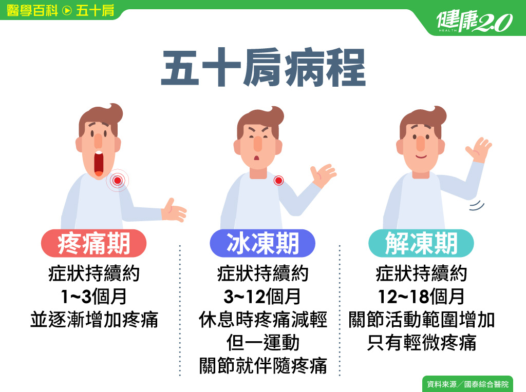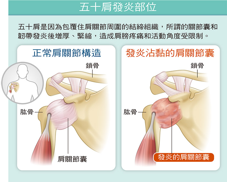 五十肩是肩痛的常見原因,會造成肩膀疼痛和僵硬。五十肩又稱為「冰凍肩」,因為肩關節像是被冰封住一樣動彈不得,一動就痛,肩膀活動範圍大大減少;像是穿了束衣在肩膀外面,肩關節腔的空間被縮緊了,動作都卡卡,一動到可能會讓人痛到流淚,甚至不動也痛,晚上睡覺更痛,肩膀無法抬高,穿衣服也有困難,大大地降低了生活品質。