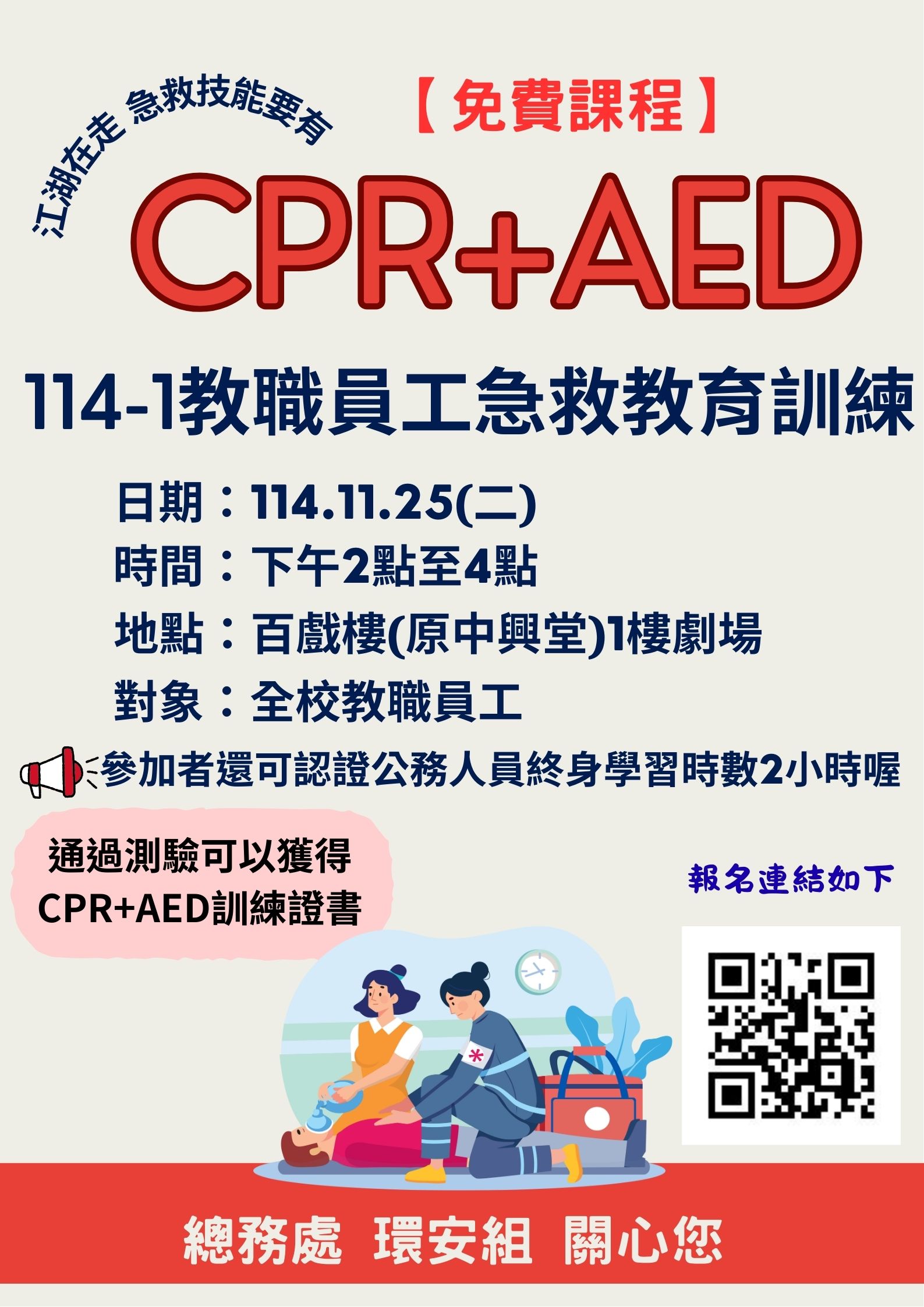 辦理114學年度第1學期教職員工急救教育訓練課程,歡迎同仁踴躍參加。