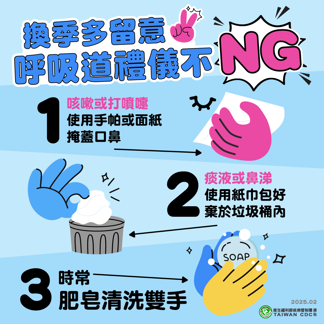 (2)做好個人衛生習慣:出現呼吸道症狀,請務必配戴口罩,勤洗手及咳嗽禮節,咳嗽或打噴嚏時應用面紙或衣袖遮住口鼻;與他人交談時,儘可能保持1公尺以上。