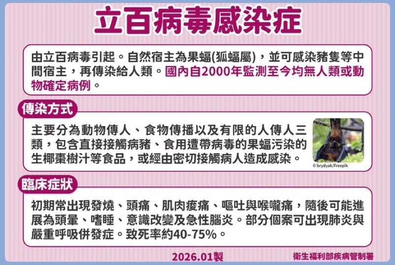 疾管署預告將「立百病毒感染症」列為第五類法定傳染病,加強監測與應變準備,提升國民意識,讓防疫走在風險之前。