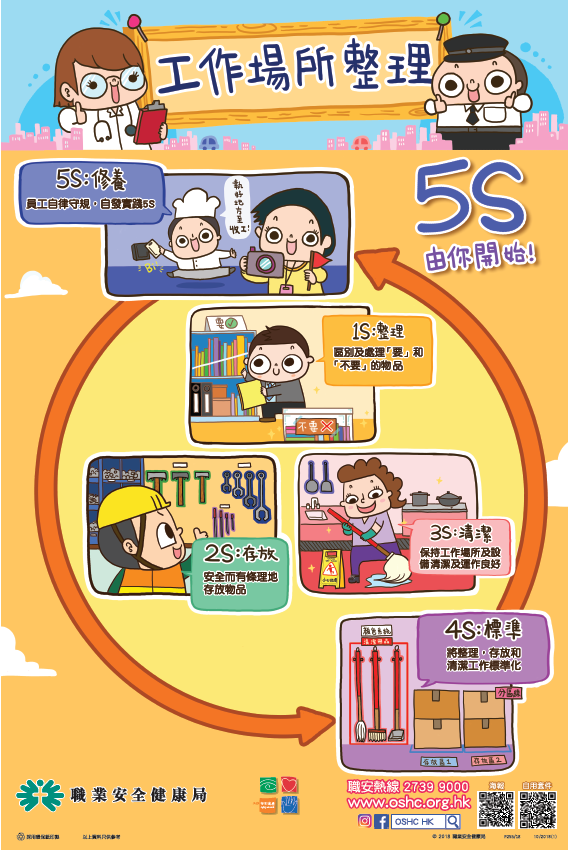 「良好工作場所整理」,5S是針對工作場所整理的一個實務管理工具,透過「整理」、「存放」、「清潔」、「標準」及「修養」五大元素,讓工作職場建立合適的整理制度,把辦公環境整理規範化等。推行5S不但能減少工傷意外,亦可以提高工作效率。