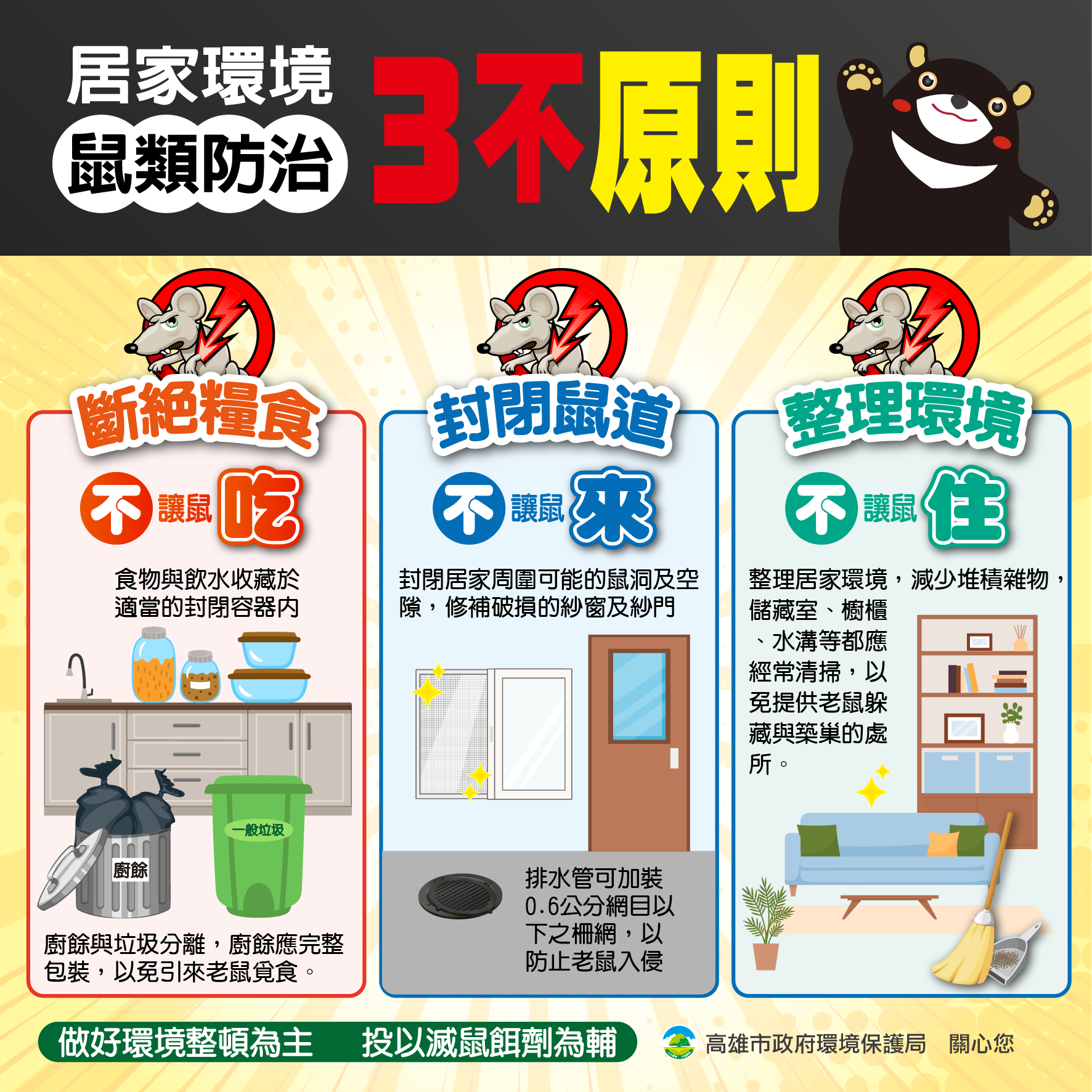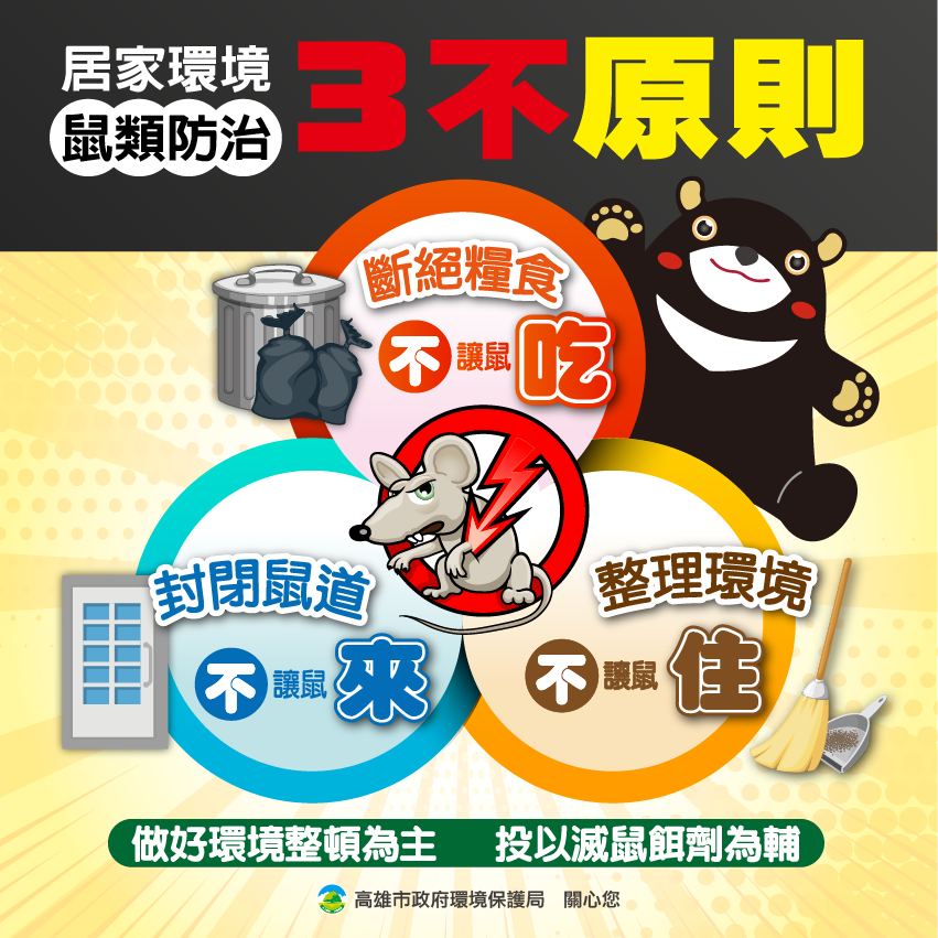 2.不讓鼠住:隨時做好環境清理,防火巷、排水設施(下水道、水溝蓋)、雜物堆,消除其棲息地。