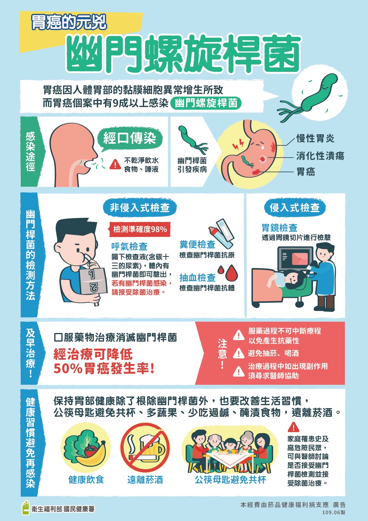 檢驗結果如為陽性,將協助民眾轉介醫療院所,由醫師評估是否進行除菌治療或安排進一步檢查。另為強化子宮頸相關癌症防治,自115年起亦將HPV檢測納入整合性篩檢服務,提供35歲、45歲及65歲女性於當年度一次HPV檢測機會,有助及早發現高風險感染者,並透過早期介入,有效阻斷病程發展。