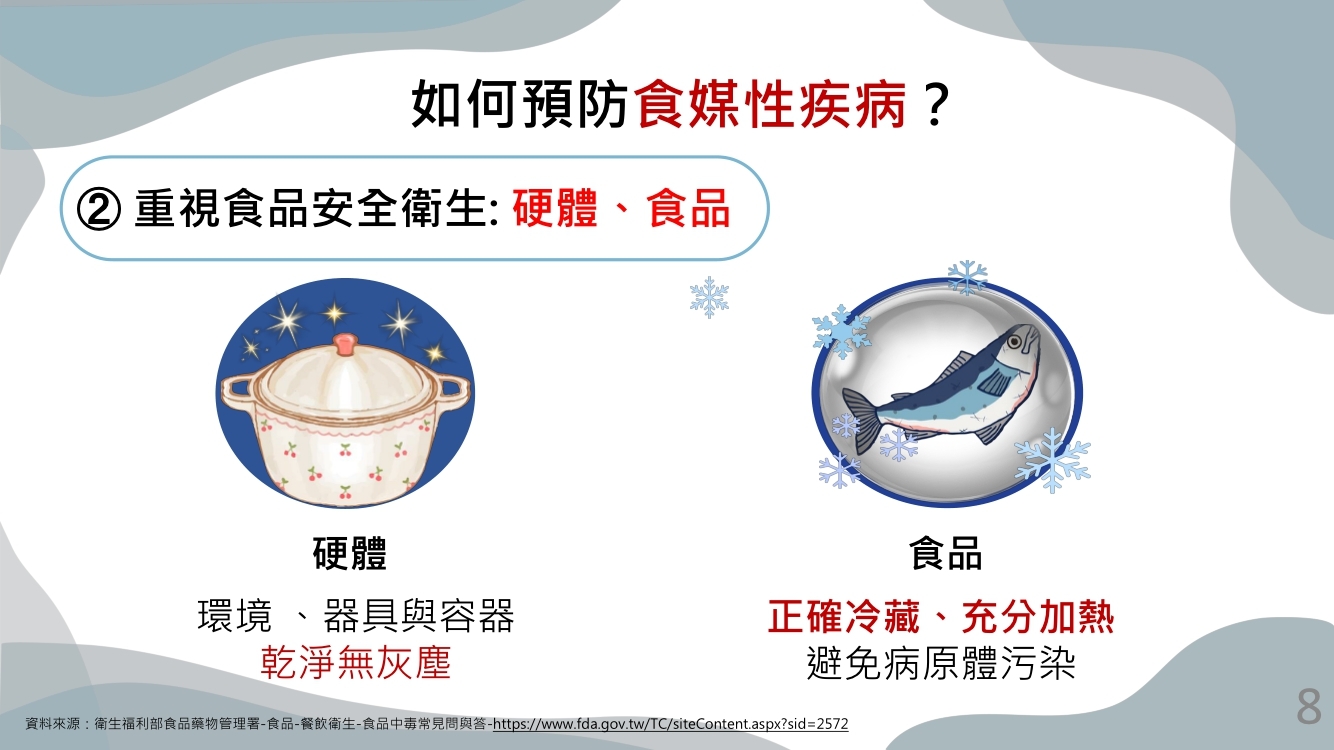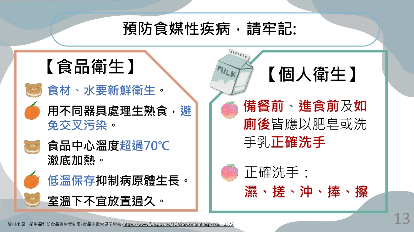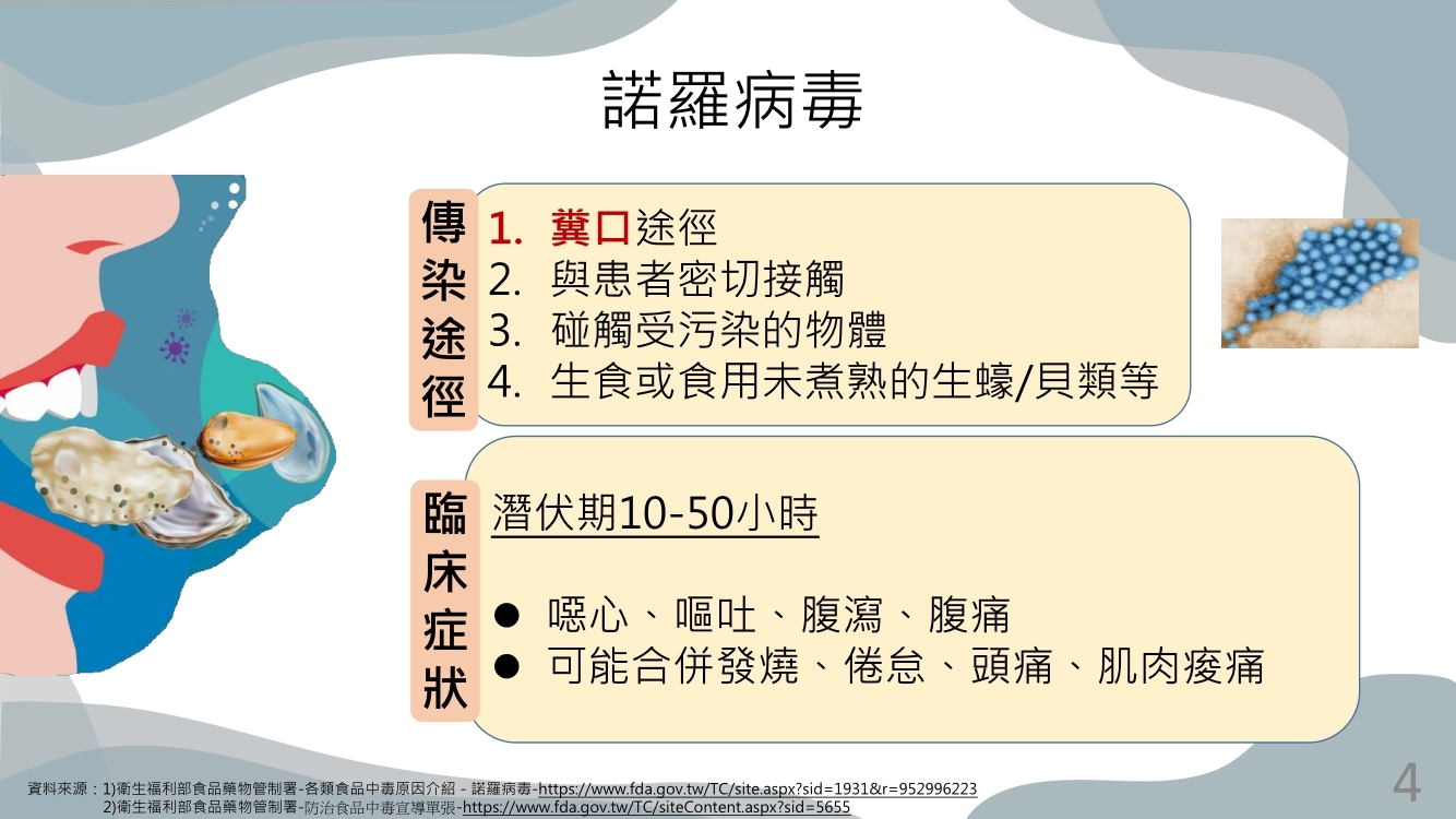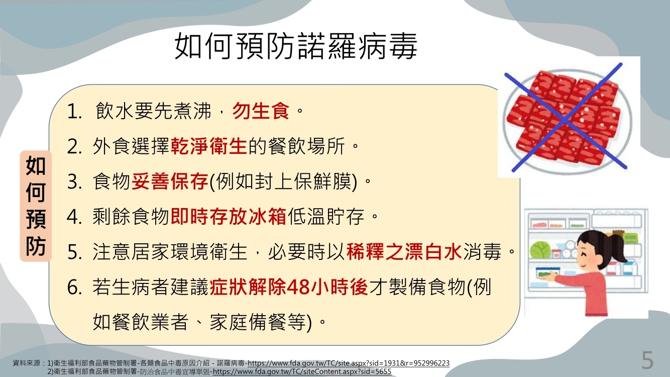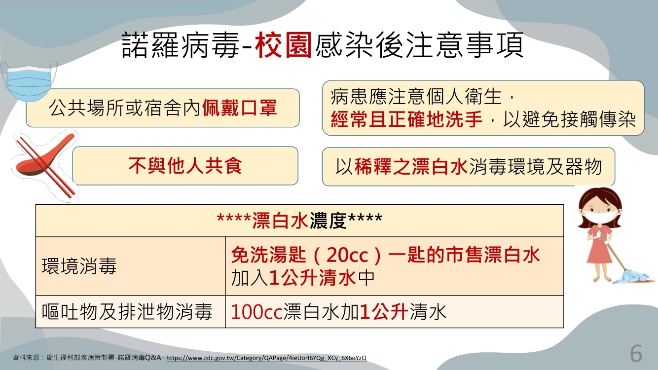 近期適逢諾羅病毒好發季節,本署亦提醒,備餐前、如廁後、或接觸任何污染物質後,應以肥皂澈底洗淨雙手,養成良好衛生習慣,有身體不適症狀時應落實口罩配戴並儘速就醫,避免諾羅病毒群聚擴散,守護自己及他人健康。